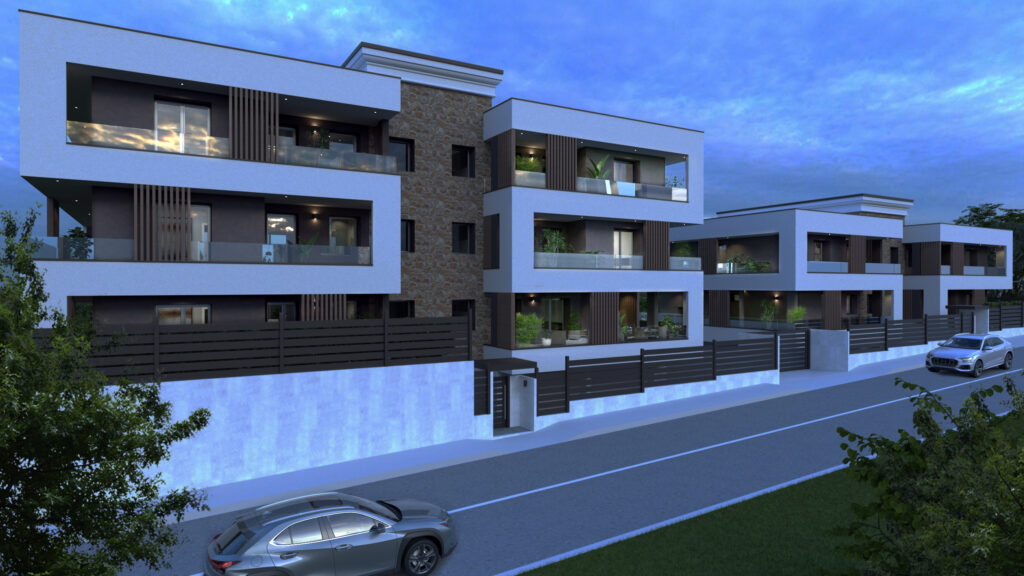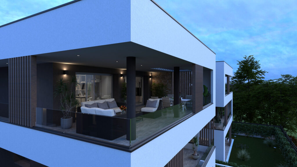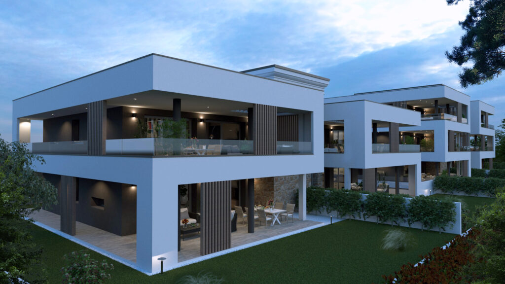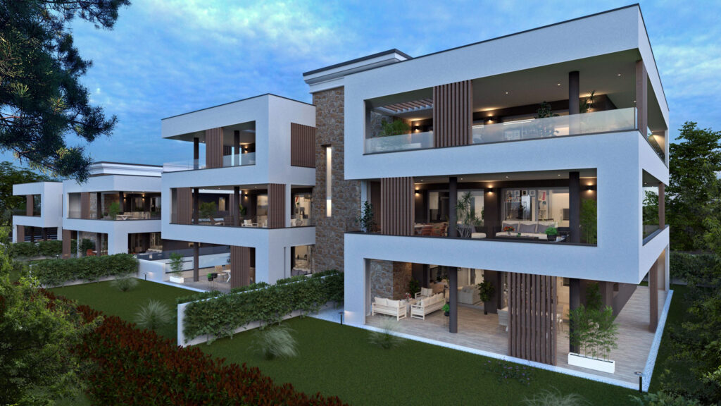 Innanzitutto, questo complesso residenziale di lusso si distingue per un design moderno ed elegante. In particolare, è caratterizzato da linee pulite, volumi ben definiti e un’attenta combinazione di materiali. Inoltre, l’architettura fonde perfettamente estetica e funzionalità, offrendo spazi abitativi aperti e luminosi. Allo stesso tempo, l’integrazione con il contesto verde circostante contribuisce a valorizzare la qualità della vita.