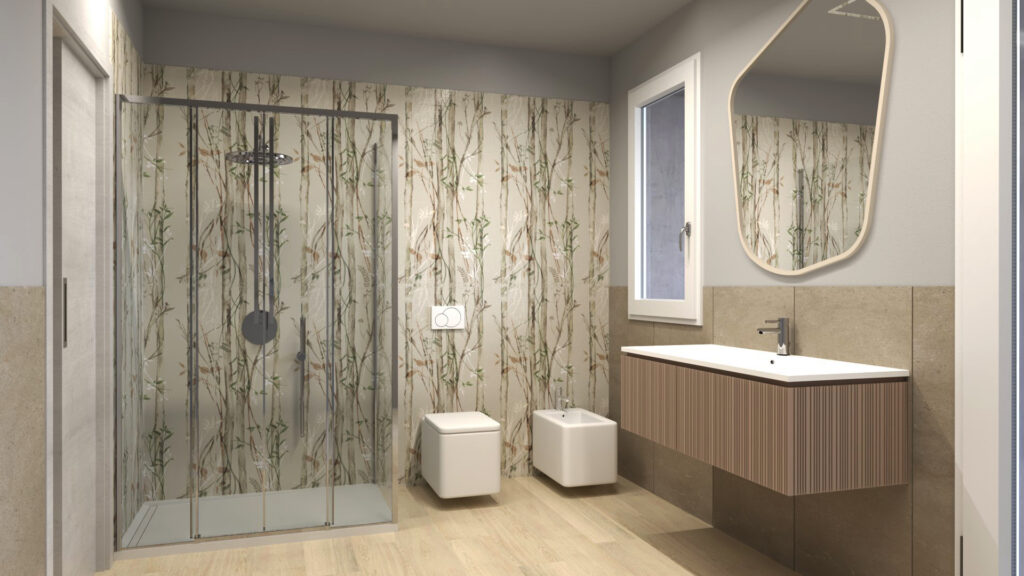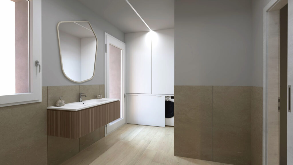 - Colori: La palette cromatica si basa su tonalità neutre con tocchi di verde salvia e blu, creando un’atmosfera sofisticata e rilassante.